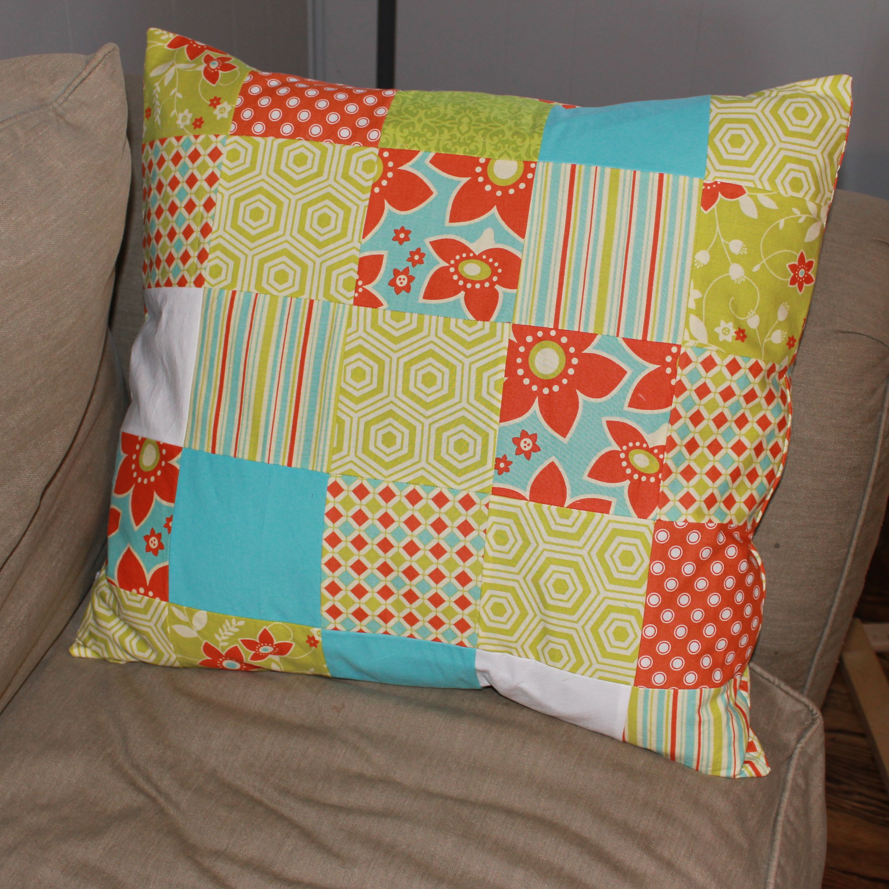 I really wanted to quilt the patchwork pillow above, but time is a little lacking right now, so quick and easy needed to prevail. Therefore I threw it together with another envelope back- so convenient! I may eventually quilt it but for now it is fine. This pillow came with my couch and while it is huge- 23 inches square- it is a fun way to showcase a big design.