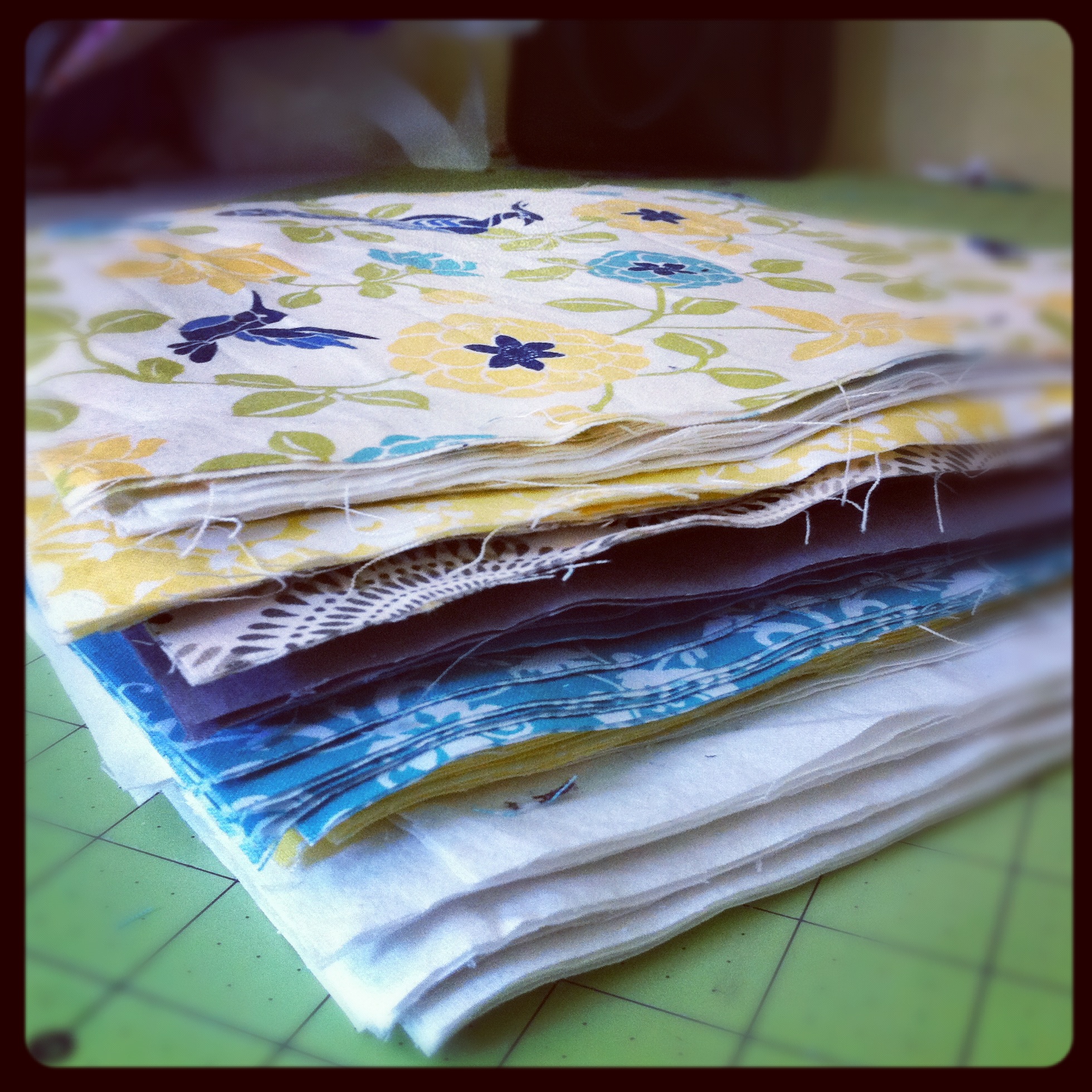 - Cut out about 100 9″ (or whatever your preferred size is) squares of varying fabrics. You want to have extra in case people mess up on one and then need to redo it.