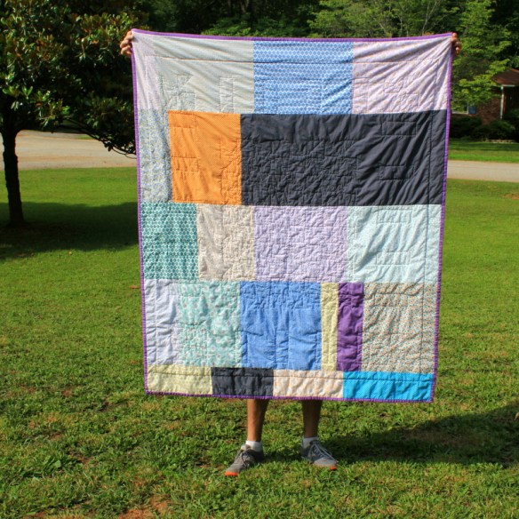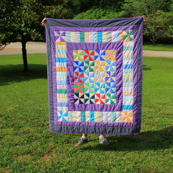 It has been so fun to finish this project. The original idea ended with the bricks stacked all around the border of the pinwheels, but I wanted this to be a nice lap size quilt so I added some Kona coal and Lizzy House Jewels to make it wider. I picked up the Jewel print a few months back out of the Whipstitch remnant bin and couldn’t be happier with how it blends into the quilt. Purple is my favorite color, and I think this quilt is a good representation of me. I hand quilted it with various Perle cottons and bound it in a Kona cotton purple (can’t remember exact shade). This is my second experience with hand-quilting and although I wouldn’t want to spend that much time with all my quilts, I did enjoy the process. For the backing, I used up the remained of the fat quarters and Kona cotton. I like the scrappy look of it.