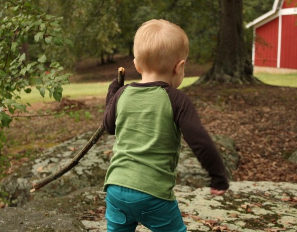 The t-shirt is the Raw-Edged Raglan pattern from Sewing for Boys. This was my first foray into sewing with knits, and I am now hooked. Seriously, no hemming! I used an old t-shirt of Ian’s for the fabric, and it is just so fun to see the Little Man in a loved shirt of his Daddy’s. I had to adjust the pattern a little because even though it says that it starts at 18 months, my pattern sheet begins at 2/3. I took about 1/4 inch of all the sides of the 2/3, and it turned out great. I love the skinny fit and super long sleeves. The only problem we ran into was that my child must have a big head because I had to stretch out the neckline quite a bit to fit it over his head. Thankfully, I was able to stretch it enough to fit without having to re-cut and sew a new neckband. FYI using freezer paper as your pattern piece makes cutting out the knit fabric so easy because you iron on the freezer paper to the knit and then pull it off to reuse after you cut the fabric.