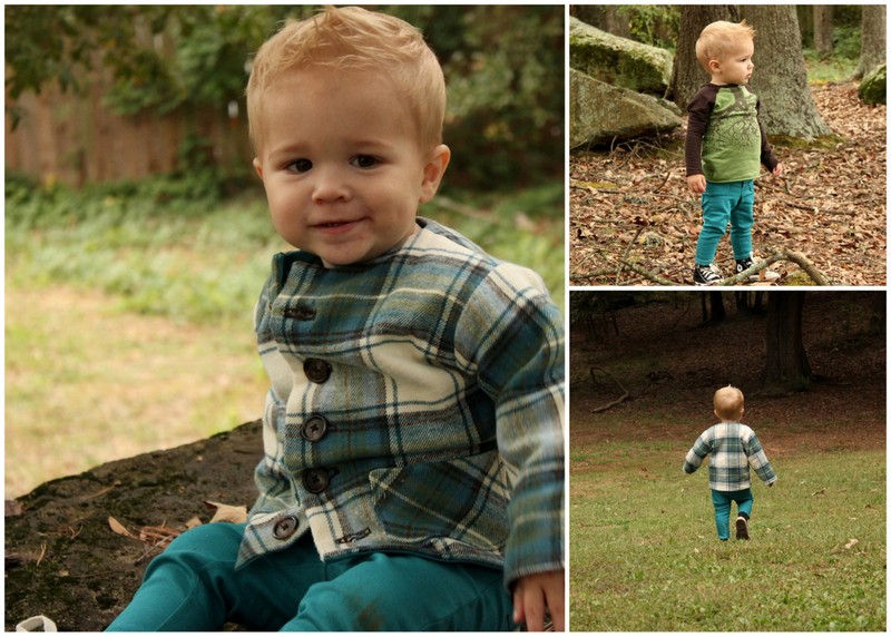 The jacket is also based on a pattern from Sewing for Boys. It is based on the Out on the Town Jacket with modifications. I wanted to have a straight-across neckline, not a sloping one like the pattern shows, so I just decided to wing it and cut out the neckline how I had pictured in my head. Guess what- turned out perfectly! Love it when that happens. I used a flannel from JoAnn for the outer and the same stretch denim for the lining. I was going for a look that was kinda in-between a button-down shirt and a jacket. If I do say so myself, I think I nailed it. This is the perfect jacket for a casual fall outing- especially around here where we are starting to get a bit of a chill at night but still have 80 degree days. This jacket came together so quickly- quite an easy sew- up until the buttons! The buttonhole foot on my machine is such a pain in the neck! I had to re-do several of the buttonholes because they were all uneven- and then the thread on the bottom was a nasty mess. I think it’s because of the thickness of the jacket that the machine didn’t feed well. If anyone has any advice for good buttonholes, I’d be glad to hear it!