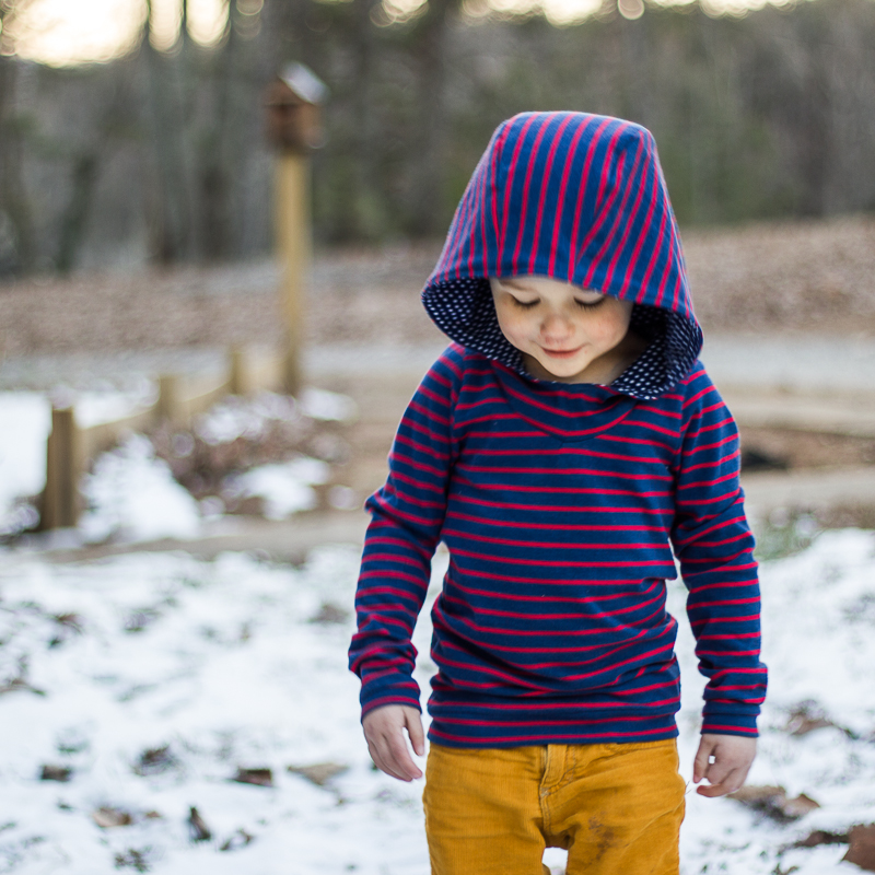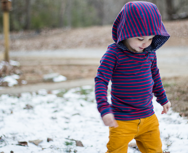 O was up from his nap when I was putting the finishing touches to his hoodie, and it was so cute because he kept asking if I were done, so he could put it on and go play in the snow. 🙂 He’s getting the hang of this blogger child thing…and the fact that photoshoots normally come with some sort of bribery. Lol. Ok, you northerners don’t laugh at our pitiful amount of snow on the ground. He doesn’t know any better!