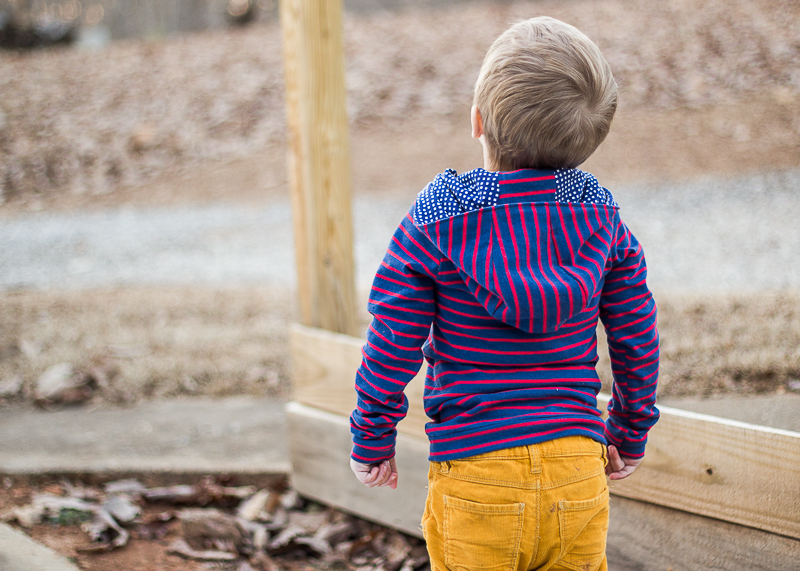 Since this jersey was similar in stretchiness (or lack thereof) to the triangle fabric from Bimaa 1, I sewed up a 4T this time and I love the fit throughout the body. The hood is a wee bit big- we think he kinda looks like a jedi knight with it pulled up. It doesn’t bother O at all though- in fact, he cried when I tried to take his hood off for a few pictures. If When I make another one, I will probably still make the 4T size but do a 3T in the hood. The hood lining fabric is from an old knit dress of mine that was in the upcycle bin.
