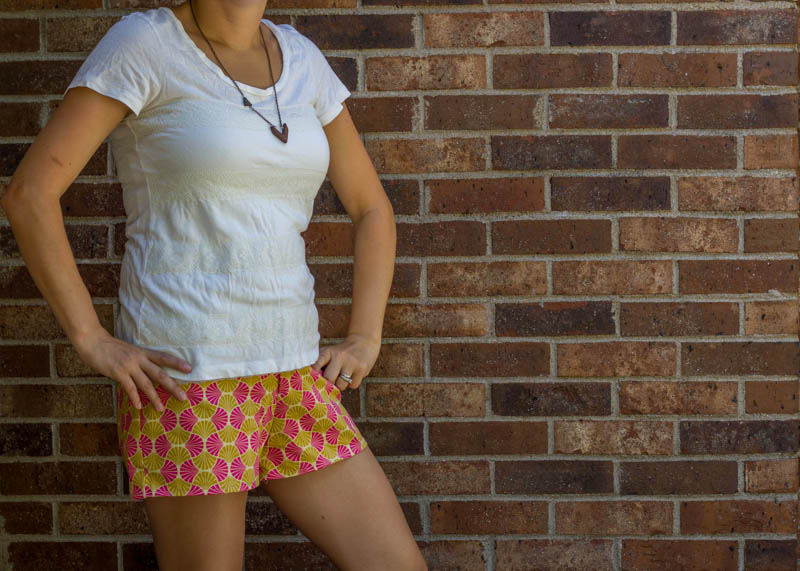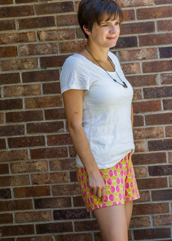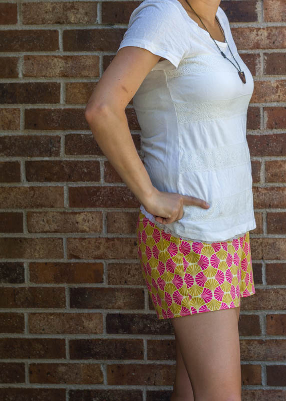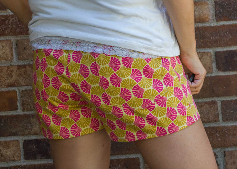 I’m pretty proud of how well I managed to pattern match on the back pockets- without even really meaning to! (And that is the only reason I’m actually showing you this cropped version of my backside…but you had to see the pockets! the things we put on the internet for blogging sake- 🙂 ) I think if I make them again- and I still have plans for another pair or two this summer, I might take in the legs just a tiny bit and lengthen the shorts also. Just to play around with it and see if I like that better. I’d love to make a lace overlay version if only I wasn’t in a fabric diet right now! Gotta use up what’s in my stash before I can get anything else.