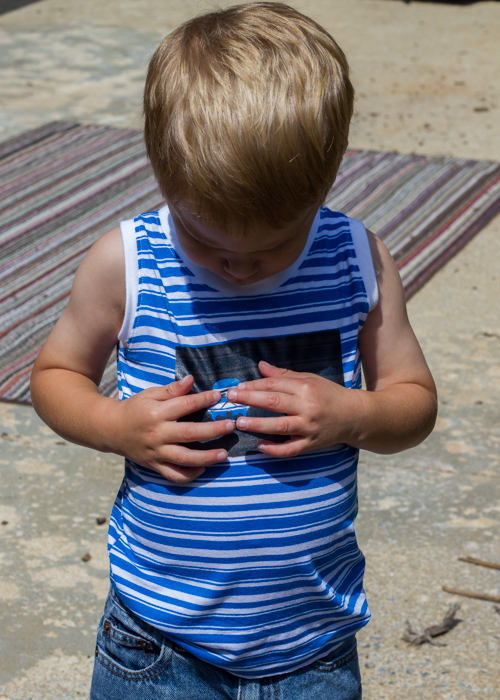 These tanks are a hack of the Flashback Skinny Tee. Fabric is a cotton/spandex knit from Girl Charlee. Eliot’s is an 18M with 1.5″ length added and Oliver’s is a 3T with 1″ length added. I used Tara’s tutorial as a basis for how to make the tank out of the tee pattern but ended up changing it up even more. One major change was that I finished the arm binding using the original instructions included in the FBT pattern for the neckline binding because my ribbing was thick and it looked funny the other way. I also didn’t hem them because I’m lazy like that. These tanks were a practice run on perfecting a tank top and while they look fine, I decided that I would like them better with a deeper neckline and armhole- kinda like the boy tanks that have become popular this season. I made another set after this that I like even better.