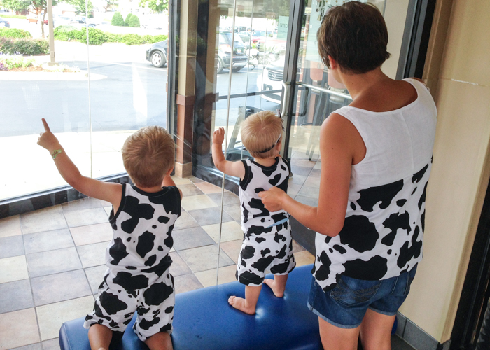 Every year in July Chickfila hosts what’s known as Cow Appreciation Day where if you dress like a cow, you get free food. We are a bit of Chickfila addicts around here so this is one of our favorite days of the year! Normally I just tape some spots onto our clothes and call it good enough but I really wanted to do something fun this year. Plus the boys needed more pjs and I figured they could use these outfits for pjs the rest of the year so it wasn’t wasted effort. Also I’m a crazy person and can’t resist the opportunity for a good cheese-fest!