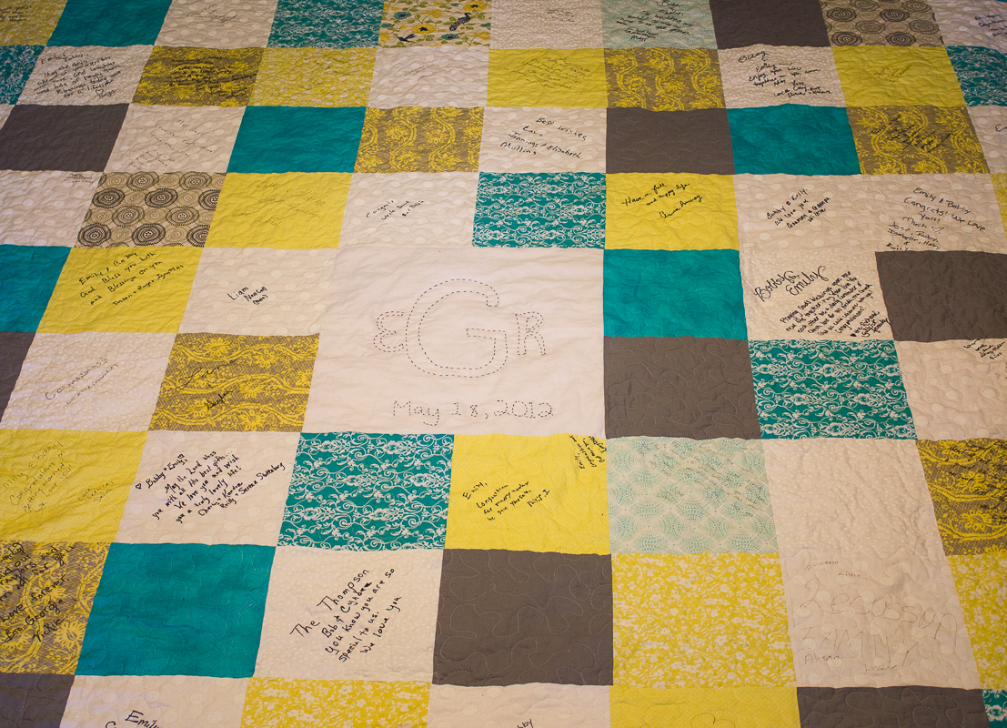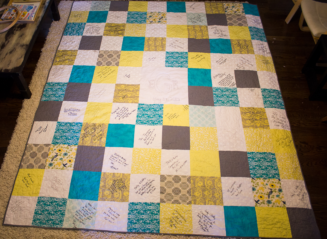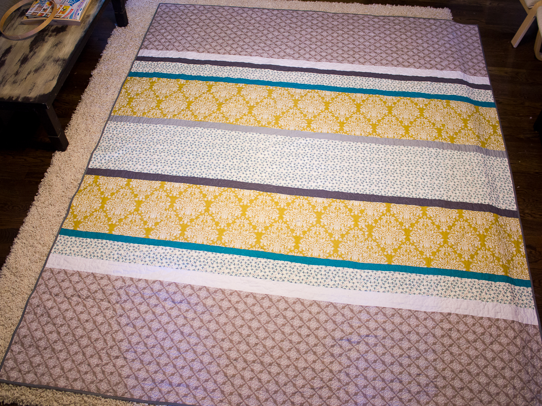 I have another installment of the gifts for my handmade birthday club members to share with you today. This is a mini quilt that I made for Jamie. Jamie had given us a great list of suggested fabrics and color schemes along with a link to her pinterest boards. While perusing her quilt board for ideas, I came across this chevron fly block that I thought would be perfect for a mini quilt. The best part is that the block is that it’s made up of half-square triangles- so easy! I played around a lot with layout and color but in the end decided to go with shades of gray with a pop of this alison glass feathers print for color. Once I made the chevron portion, I improvised the rest of the quilt top- putting the different ideas up on my design wall until I settled on varying widths of the fabrics for a bit of a stripe effect.