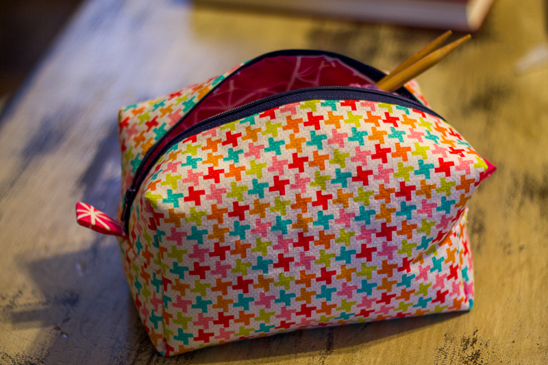 After my fun with knits during Kid’s Clothes Week, I promised myself that I would get my serger out and take that class ASAP! And this week (while my sewing machine was in the shop) was the assigned week. I just have a cheap serger (a Singer ProFinish that I got for my birthday 2 years ago) because I didn’t want to invest in a really nice one until I knew I would use it. I did, indeed, begin the class this week and am happy to report I completed my first project from the class. I think it turned out not-too-shabby… If I do say so myself. I’ve been wanting to make a boxed bag for a while and really love how easy it was. Can’t believe I made the entire thing with my serger! Also it turned out to be the perfect size for my latest knitting project- to be discussed later.