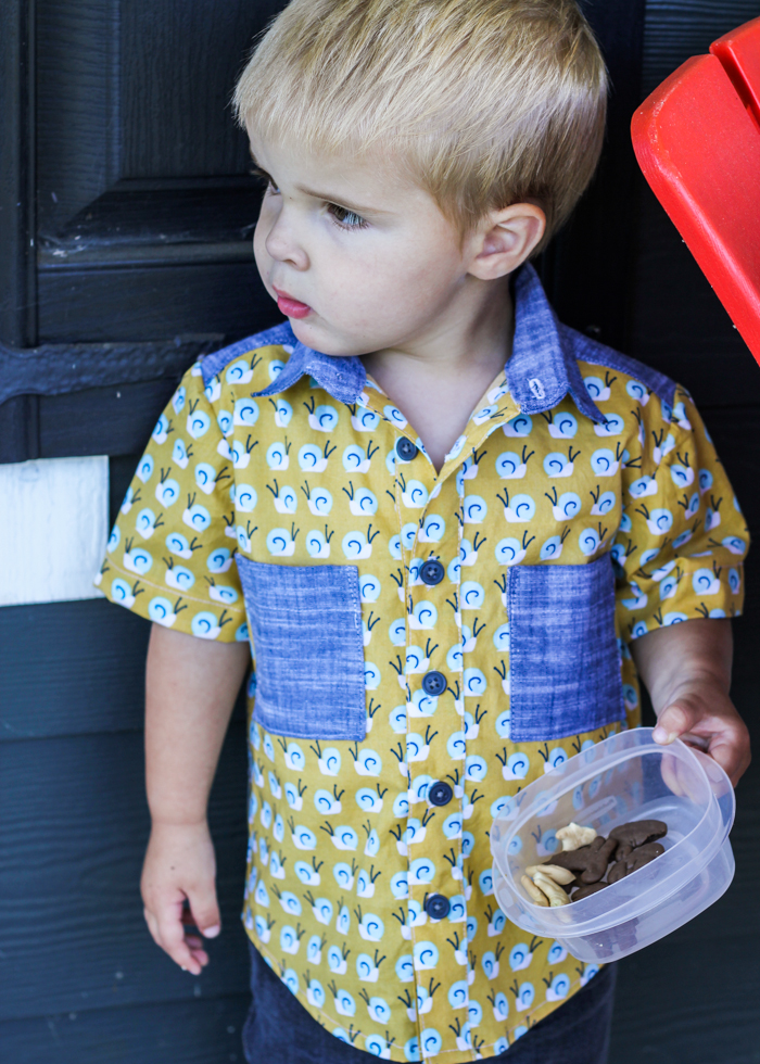 The 2t size ended up fitting Eliot fairly generously- leaving plenty of room to grow, but I’m happy with that because now it will hopefully last him a while before he grows out of it. Two year olds are a bit of a booger to photograph- hence the animal cracker bribes you see in this pictures. Whatever works, amiright? Anything is better than crying pictures. And that wraps up my summer 2015 kid’s clothes week! I didn’t stick too closely to the travel theme but I kinda feel each of my items could loosely work in that framework…I mean, snails are always traveling around to get places, right? 😉