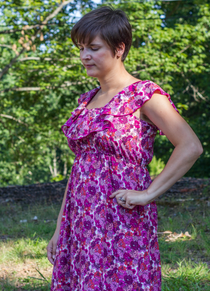 I am beyond excited to share this dress with you today. See I’ve been wanting a maxi dress for, like, ever. 😉 Unfortunately due to my height and figure it’s really hard to find one that’s flattering on me. (I have a very wide torso and am basically straight down with no waist definition at all- kinda the opposite of an hourglass) I’ve been thinking it would be fun to try to make my own maxi but couldn’t settle upon the perfect pattern for it. Sometime after making my waterfall tank– pattern by Sew Caroline, I realized that with some tweaks I could make that into a maxi dress pattern. But then I realized I needed some major fabric yardage to make this idea into a reality. Enter my Liberty of London for Target dress that  I thrifted over 4 years ago!! (yeah sometimes it takes me a while to get around to things-lolz) I found this dress at a Goodwill (along with a sweet Liberty of London tie for the hubs) and even though it was several sizes too large and had a weird off the shoulder thing going on, I knew I had to have it if just for the fabric. When I brought it home, I attempted some revisions on it, but they didn’t work out and it’s sat in my mending bin ever since.